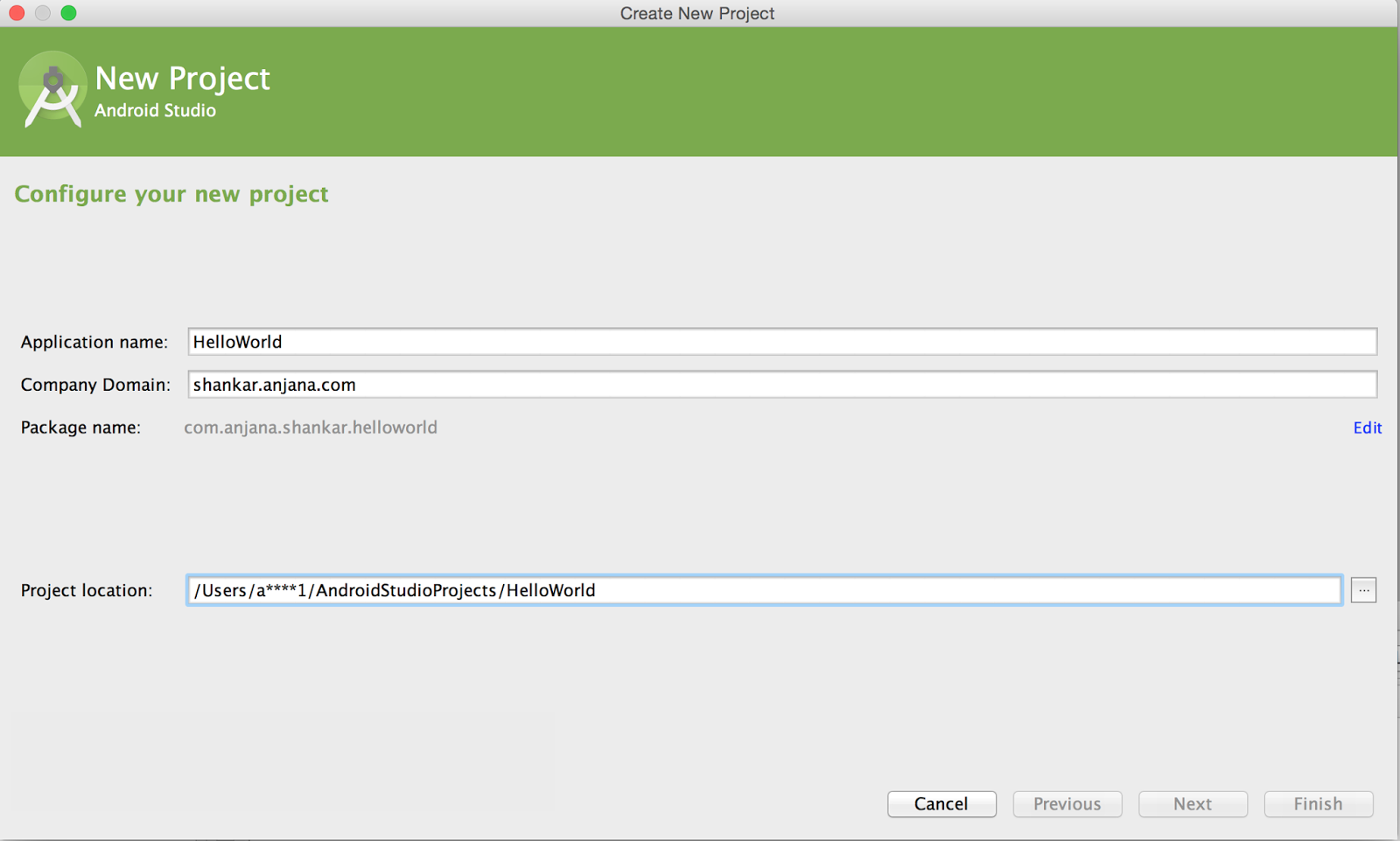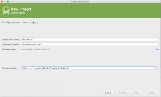 In the project Wizard, set up the App name to be HelloWorld. Then provide a package name. Remember that the package name should be globally unique across all packages installed on Android. Next, choose your project location and hit next.