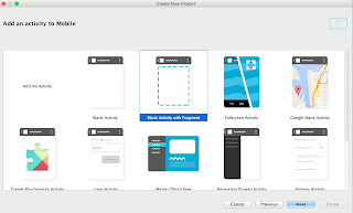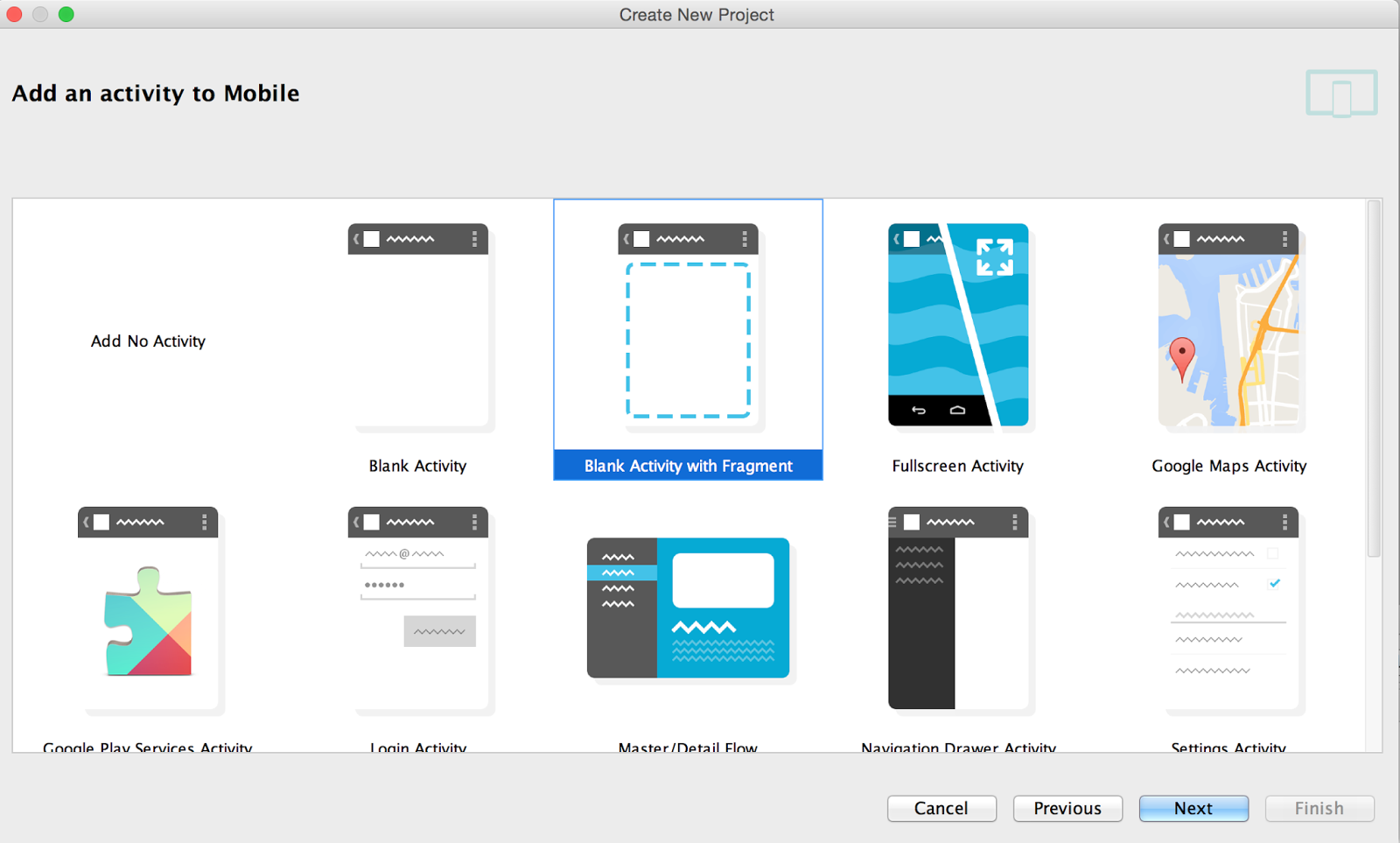 Next, we have to choose an Activity. We choose a Blank Activity with Fragment. An activity serves as a presentation layer for the UI and a fragment represents a behavior or portion of the screen.